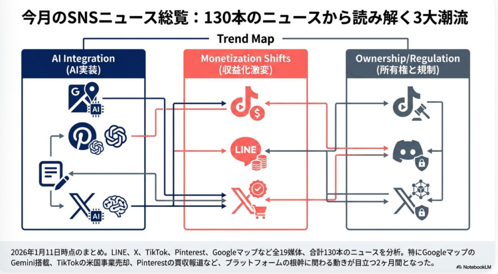 2026年1月11日配信のSNS最新ニュースまとめ。Meta社の3種SNSとYouTubeを除く19大SNSの2025年12月〜2026年1月の動向を紹介。LINE公式アカウントの新機能追加、X(旧Twitter)のAI画像編集機能の有料化、TikTokの米国企業への移行、GoogleマップへのGemini搭載など、計130件のニュースを網羅。各SNSの仕様変更や新機能、収益化の動きが活発化している様子が伺える。