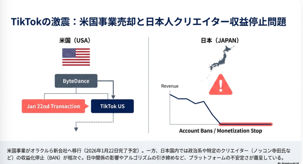 A2: 2026年1月22日を予定しているアメリカ企業への所有権移行により、プラットフォームの運営方針が大きく変わる可能性があります。特に、中国政府の影響を受けていると批判されていたコンテンツモデレーションや収益化停止問題が改善される可能性があります。一方で、アメリカ主導の運営になることで、コンテンツポリシーやアルゴリズムが変更され、日本市場特有のコンテンツへの影響も考えられます。広告主にとっては、プラットフォームの信頼性向上により広告投資がしやすくなる可能性があります。