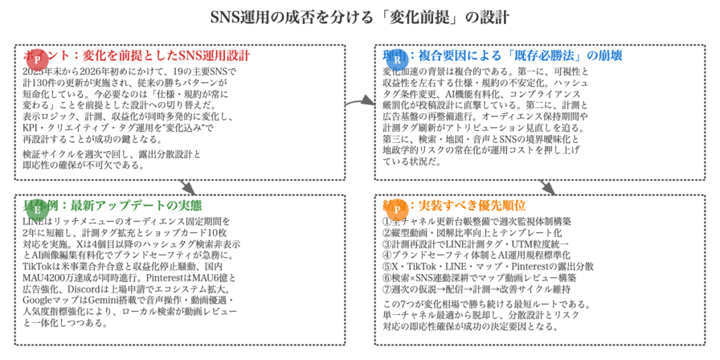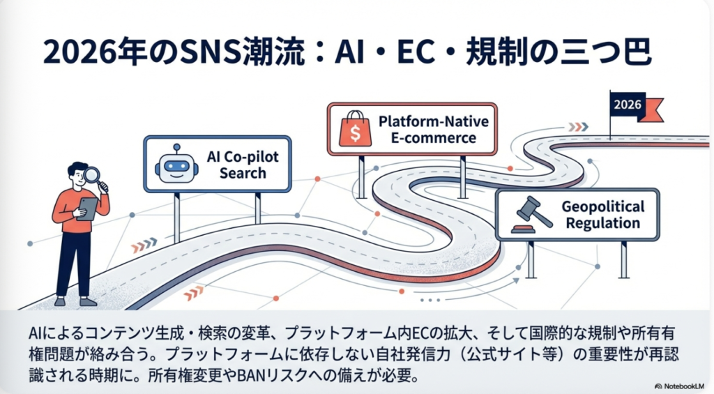 2026年のSNSマーケティングは、まさにAI技術との融合と、ユーザー体験の革新が加速する年となることが明確になってきました。今回ご紹介した130もの重要ニュースを振り返ると、いくつかの大きなトレンドが浮かび上がります。