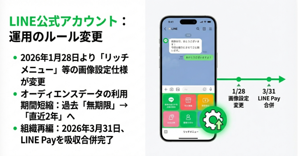 📱 LINE公式アカウント 企業や店舗がLINE上でユーザーとコミュニケーションを取るための公式アカウントサービスです。リッチメッセージやリッチメニューの画像設定変更、ショップカードの複数枚対応(最大10枚)、計測タグの追加など、2026年1月に多数の仕様変更が実施されました。ミニアプリでの課金機能やAIアンケート作成機能も追加され、ビジネス活用の幅が広がっています。