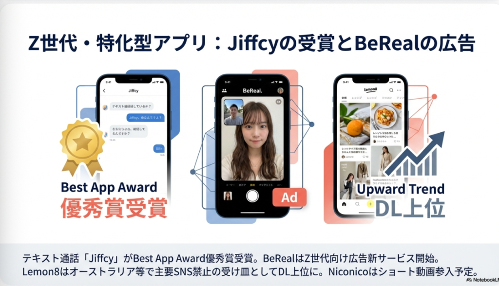 Lemon8の方なんですが、オーストラリア、SNS禁止対象外アプリがLemon8などダウンロード上位に 大手SNSが全然使えないんですね。それによってLemon8がダウンロードが上位に来てるということですね。まあ使えないんだったら使えるもの使うってことなんでしょうけど、いう形になってます。そしてニコニコ動画ですね、ショート動画を2026年春リリース予定っていうことでこれまたですね、随時追記していきたいと思いますので見といてください。