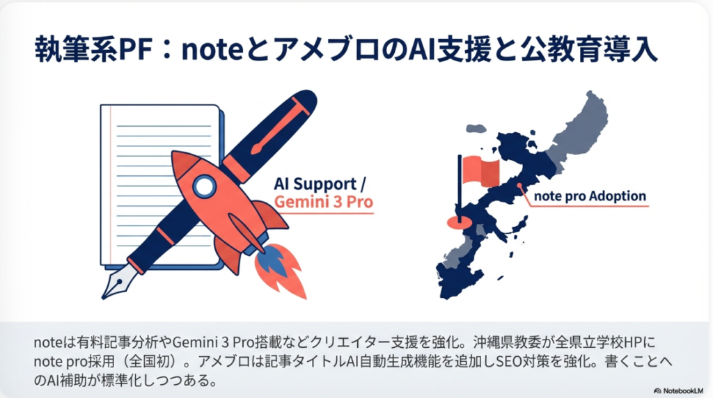 では続きますね。noteに関するニュースを見ていきましょう。note、約30万件の有料記事を分析。はじめたばかりでも収益につながりやすいテーマが判明、自分の経験や知識が、毎月の収入に。noteでサブスク収入を得るクリエイター数が前年比2倍、お金で揉める家庭に育った”コールの女王”がnoteで3億稼ぐ。20代キャリアは「可能性を潰せ」、note、「推しのアーティストランキング2025」発表 総合1位はtimelesz、急上昇1位はHANA 。note、Google の Gemini 3 Pro をAIアシスタントに搭載っていうニュースが入っています。note、生成AIの社会実装を加速する国家プロジェクト「GENIAC」に採択、note、従業員持株会の奨励金を最大30%へ引き上げ、note、AI時代のコンテンツの権利を守る国際標準「RSL」の日本初、公式プラットフォームパートナーに、note proが「IT導入補助金2025」対象ツールに認定、note、非エンジニアを含む全職種にAIコードエディタ「Cursor」を導入ということですね。ゼロクリック時代でも読まれるコンテンツとは? 生成AI経由の流入増のnoteから学ぶ。日本初の複合書籍チャート「Billboard JAPAN Book Charts」にnoteの読書記事データを提供開始、沖縄県教委が、全県立学校の公式HPにnote proを採用。連携協定を結び、全84校がアカウントを一斉開設。