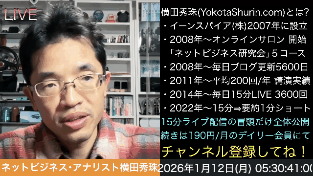 今日もネットビジネスに関する情報を生中継で15分間お届けしてまいります。今日もよろしくお願いします。今日は2026年1月11日の日曜日になりました。週末ですので、今日のテーマはこちらになります。2026年1月までMeta社の3種SNSとYouTubeを除く19大SNSのニュースということでお話をしていきたいと思うんですが、実は12月分の発表が間に合わなくてできなかったので、今回は12月分と1月分、まだ10日しかありませんけど、合わせてお話をしていきたいなと思います。
