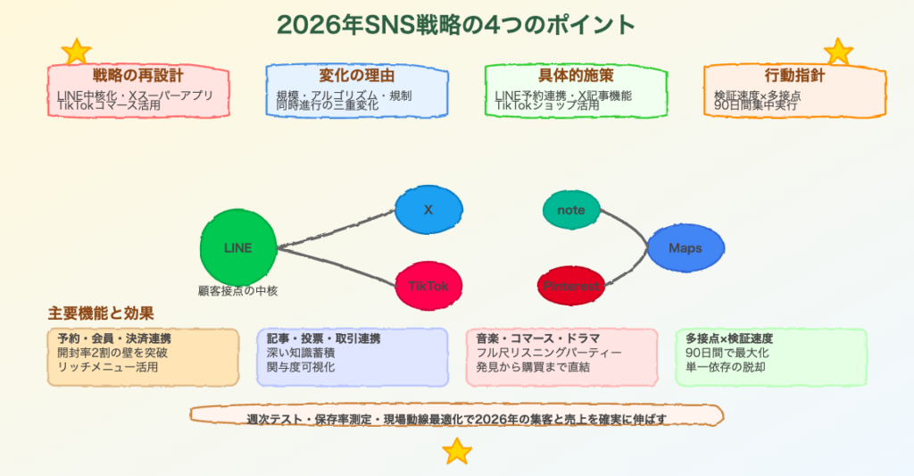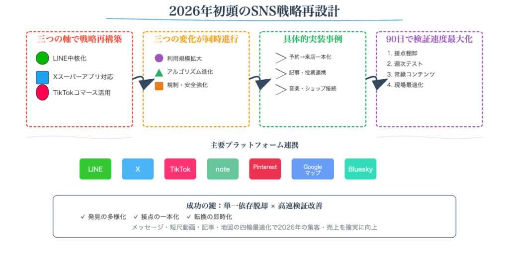 私の「Sunday Live」を通じた継続的なウォッチングの結果、導き出された結論は一つだ。2026年、SNSマーケティングの主戦場は「認知」から「インフラ統合」と「信頼の資産化」へ完全に移行した。