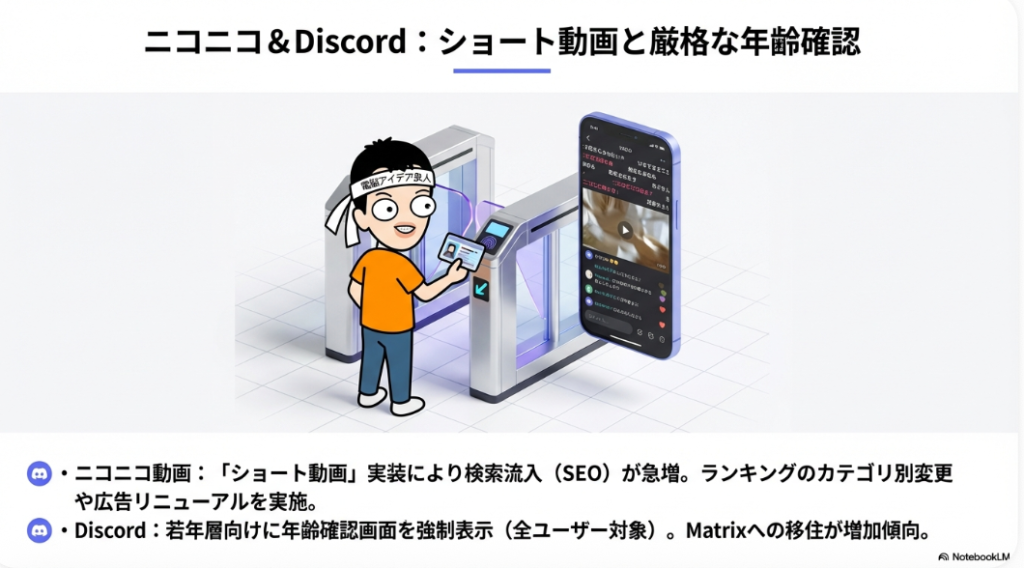 しかし、プラットフォーム側は「安全と信頼」という壁に突き当たっている。EUによる「無限スクロール」廃止の動きや、Discordにおける年齢制限の厳格化、さらにはDiscordから中央集権的でない「Matrix」へのユーザー流出といった動きは無視できない。企業は「中毒性」に依存するマーケティングから、若年層の安全を守りつつエンゲージメントを高める「健全なコミュニティ運営」への転換が急務だ。