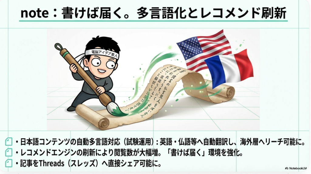 • noteのグローバル展開とエコシステム統合: noteが開始した「自動多言語対応」と「レコメンドエンジン刷新」は、日本語コンテンツを瞬時に世界へ解き放つ。さらにThreadsへの直接シェア機能の実装など、プラットフォーム間の壁を取り払う動きが加速している。