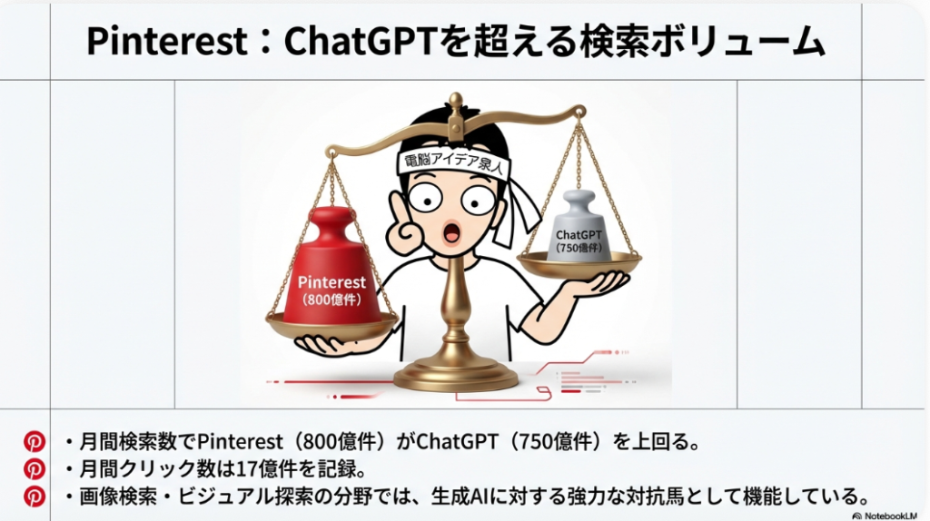• Generative Discovery Optimization(GDO)への移行: 検索回数において、Pinterest(800億件)がChatGPT(750億件)を僅差で上回っているという事実は示唆に富む。ユーザーは「検索窓」ではなく、「視覚的探索」や「AIとの対話」によって情報を得るようになっている。