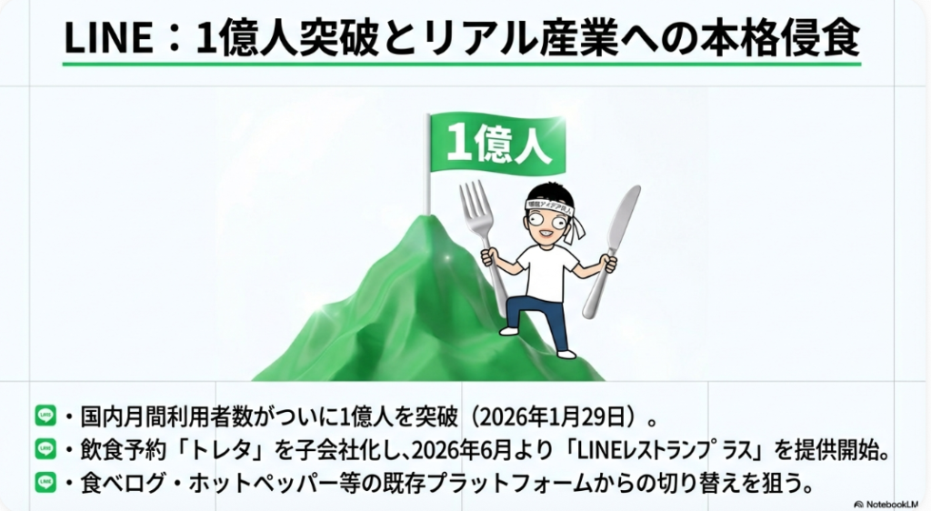 3:09 🍽️ LINE新サービス&ユーザー1億人突破