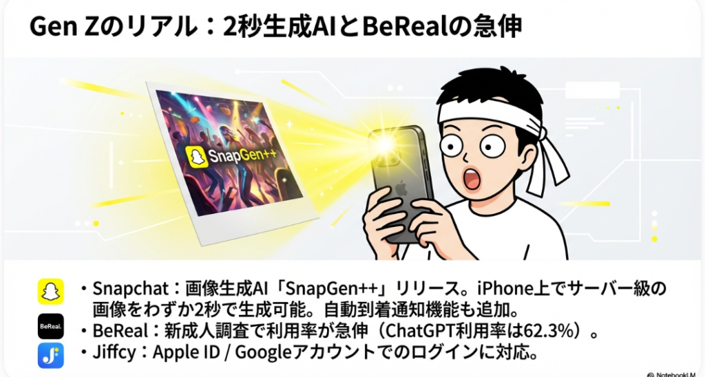 • 生成AIによるクリエイターエコノミーの変容: Snapchatが導入した画像生成AI**「SnapGen++」は、iPhone上でわずか2秒**で高品質な画像を生成する。このスピード感はコミュニケーションのあり方を根本から変え、クリエイティブ制作のコストを実質ゼロへと押し下げた。