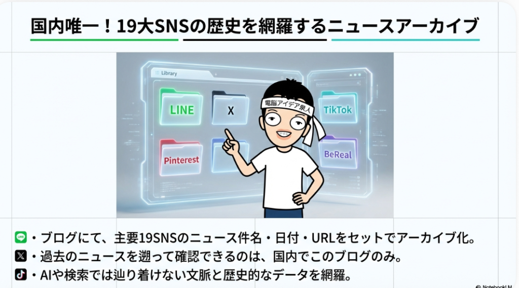 このような形式で、あらゆるSNSの過去ニュースをタイトル・日付・URLのセットで網羅的に管理・公開している人は、国内ではおそらく1人しかいないでしょう。最近ではAIに聞いたり、SNSで検索すれば最新情報は手に入りますが、過去のニュースを時系列でたどれる場所はほとんど存在しません。それほど手間のかかる作業を継続しているこのまとめにたどり着けた方は、ぜひブックマークしてチェックしていただければと思います。