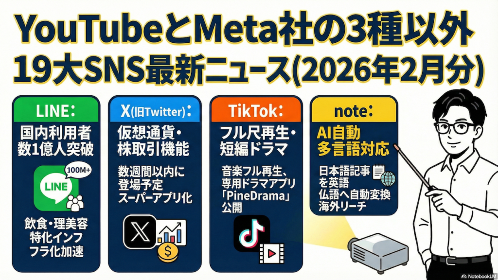 2026年2月時点のMeta・YouTube以外の主要SNS19種の最新ニュースをまとめた内容。LINEの国内月間利用者数が1億人突破、Xへの仮想通貨・株取引機能の実装、TikTokのフル尺音楽再生対応、noteの多言語自動翻訳試験開始など、各SNSが機能拡充を急ピッチで進めている。AIの普及やショート動画の台頭が各プラットフォームの戦略に大きく影響している。