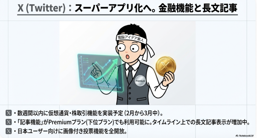 • 「会話」から「経済活動」への変容: 数週間以内に実装される**「仮想通貨・株取引機能」**により、Xのタイムラインはリアルタイムの投資プラットフォームへと変容する。これによりユーザーの滞在目的は情報の消費から、資産運用を伴う経済活動へと拡張される。