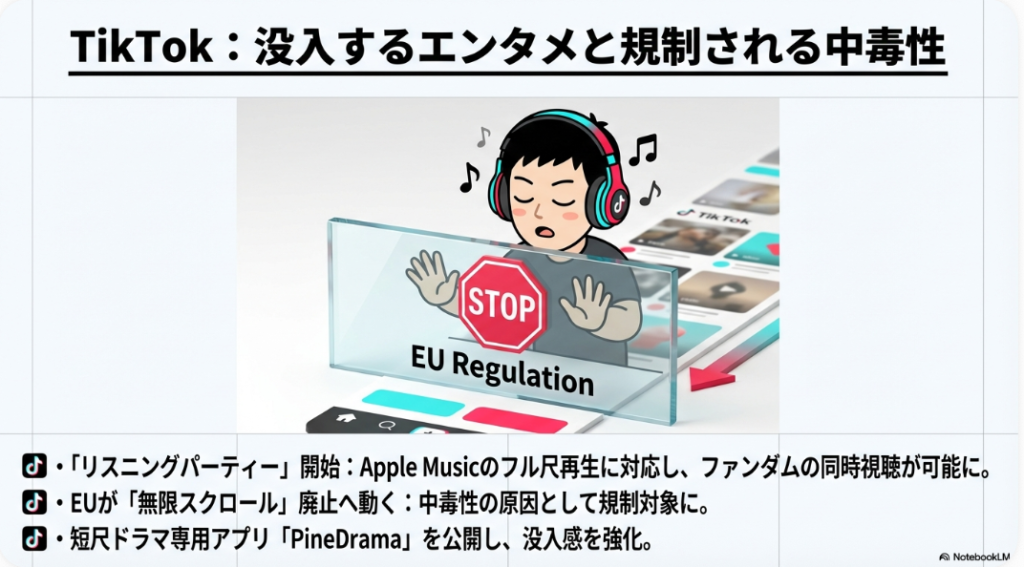 • エンターテインメントの垂直展開: 短尺ドラマ専用アプリ**「PineDrama」の公開や、Apple Musicと連携した「リスニングパーティー(フル尺再生)」**の実装は、ユーザーの可処分時間を断片的にではなく「塊」で奪う戦略である。