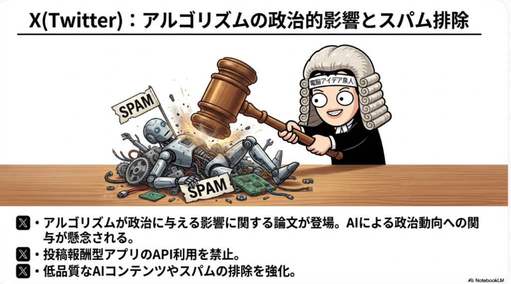 🤖 AIボット・スパム対策(X) X上でボットが急増しており、AIによって政治的世論が操作されるリスクが高まっている。学術論文もこの問題を取り上げており、Xはすでに投稿報酬型アプリへのAPI利用禁止や低品質AIコンテンツの排除を打ち出した。SNS上の情報の信頼性確保が急務となっている。