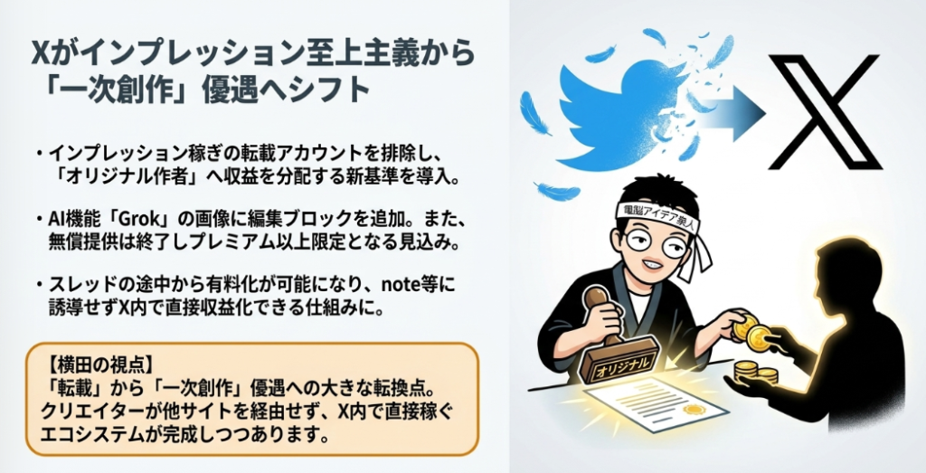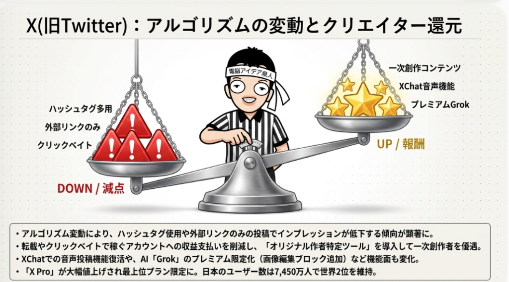 一方でアルゴリズムも大きく変更され、多くのアカウントでリーチが伸びにくくなったという声が相次いでいます。投稿頻度や内容の見直しが必要な時期に入っており、継続的な検証が欠かせません。また旧TweetDeckであるX Proが最上位プラン(月額6,080円)限定となり、Ask Grok機能の無料提供も終了するなど、有料化の流れが加速しています。さらに注目すべきは、スレッドの途中から有料化できる新機能の導入予定です。noteなどの外部プラットフォームに誘導せずX内で収益化できる仕組みは、クリエイターエコノミーに新たな選択肢をもたらします。加えてXは著作権管理を強化し、JASRACと非契約のため歌ってみた系投稿の音声をミュートする措置も開始しました。20大SNSの中でもXは変化の激しいプラットフォームとして、常に最新動向の追跡が必要です。