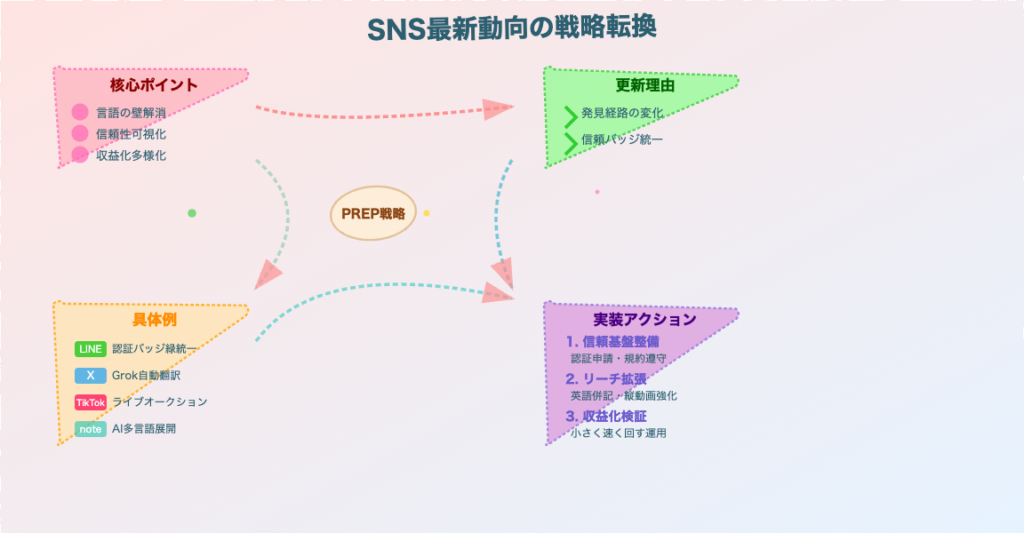 2026年の20大SNS業界を俯瞰すると、業界全体を動かす大きな潮流が3つ見えてきます。第一に「AIによる言語バリアの崩壊」です。XがGrokによる自動翻訳機能をリリースし、海外ユーザーの投稿が日本語に自動翻訳されてタイムラインに流れ込むようになりました。noteも約2万記事から自動多言語対応を開始しており、これまで国境で分断されていたSNSのコンテンツ流通が根本から変わりつつあります。