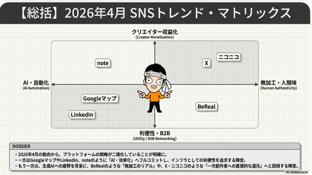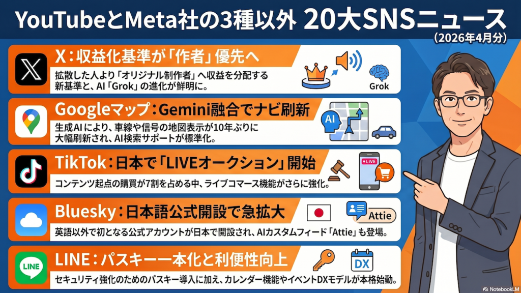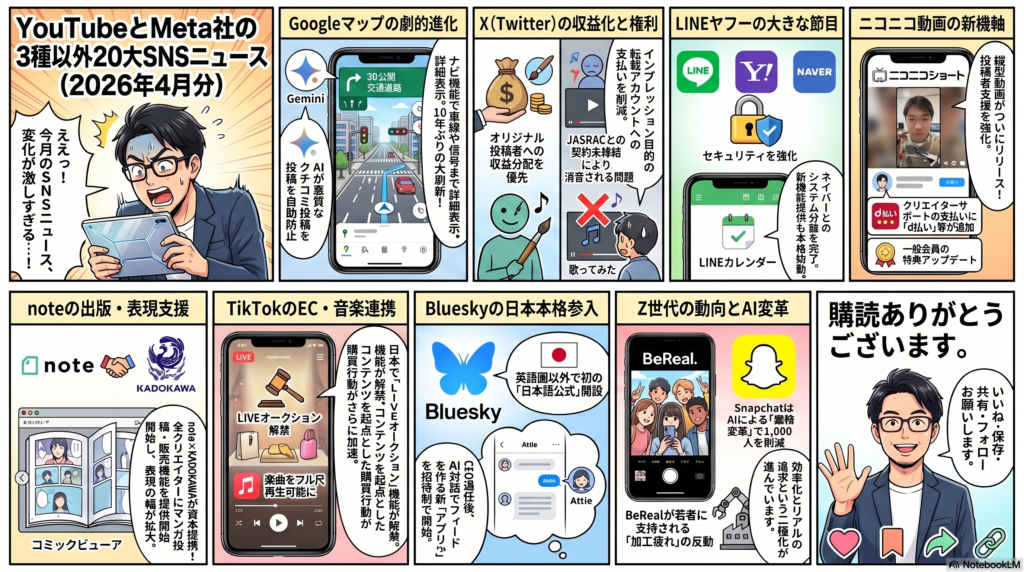 今回は2026年3月から4月までの2ヶ月分の20大SNSニュースを、Meta社の3種SNSとYouTubeを除いて一気にご紹介してきました。LINEヤフーのシステム分離完了やパスキー一本化、LINEのスターリンク対応、XのGrok自動翻訳による言語の壁突破、TikTokのApple Music連携によるフル尺再生対応、noteのコミックビューアやAIコンテキストネットワーク開始、さらにはDiscordの年齢確認導入延期など、どれも見逃せない大きな動きばかりでしたね。特にXのGrok自動翻訳はSNS業界における革命と言えるほどのインパクトがあり、これからのコンテンツ発信の在り方を大きく変えていくはずです。数が多くて後半は駆け足になってしまいましたが、ブログにリンクを貼ってありますので、気になるSNSや記事があればぜひクリックして詳細をご確認ください。まとめるのは大変な作業ですが、2ヶ月に1回ペースで継続していきますので、ぜひ次回の更新も楽しみにお待ちいただければと思います。
