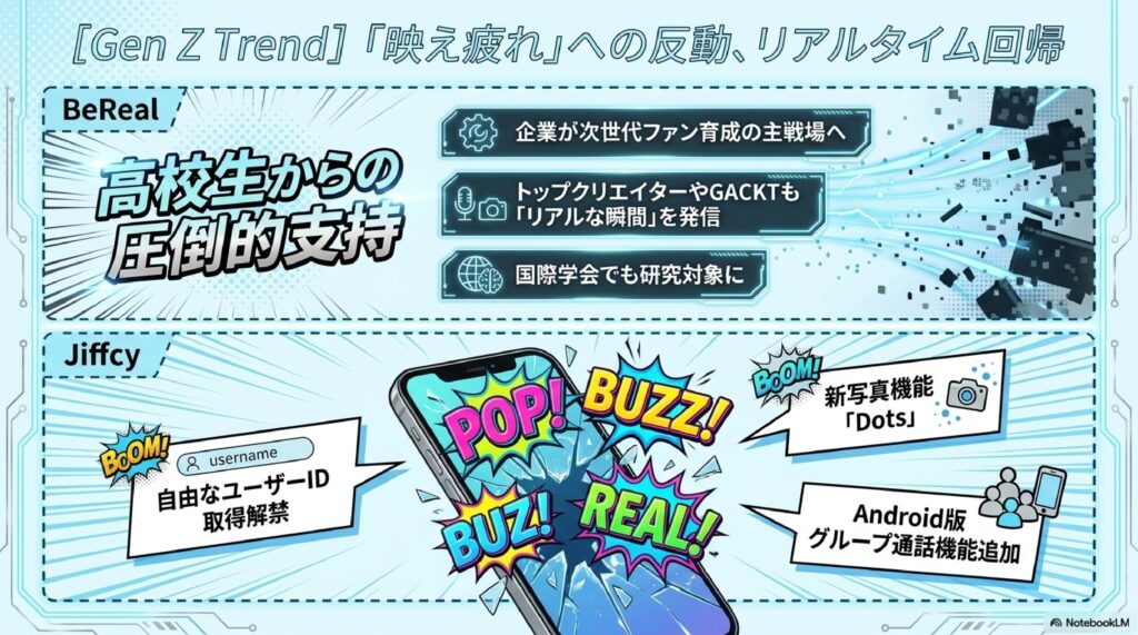 かつて日本のSNS黎明期を築いたmixiの後継「mixi2」も静かに歩みを進めており、公式アカウントの発信を追うことで最新動向を把握できます。若年層に刺さる新機軸として注目されるJiffcyも、大型アップデートで写真機能「Dots」をリリースし、自由なID取得、Androidでのグループチャット・通話機能追加、シングルサインオン導入と矢継ぎ早の強化を実施しています。POPOPOやBeReal、Clubhouse、NoPlace、Snapchat、Lemon8といった20大SNSに名を連ねる他の新興サービスも、それぞれ独自のポジションを模索中です。主要SNSが成熟しレッドオーシャン化する中、新興SNSへの早期参入は、20大SNSを戦略的に活用したい個人・企業にとって見逃せない機会となっています。