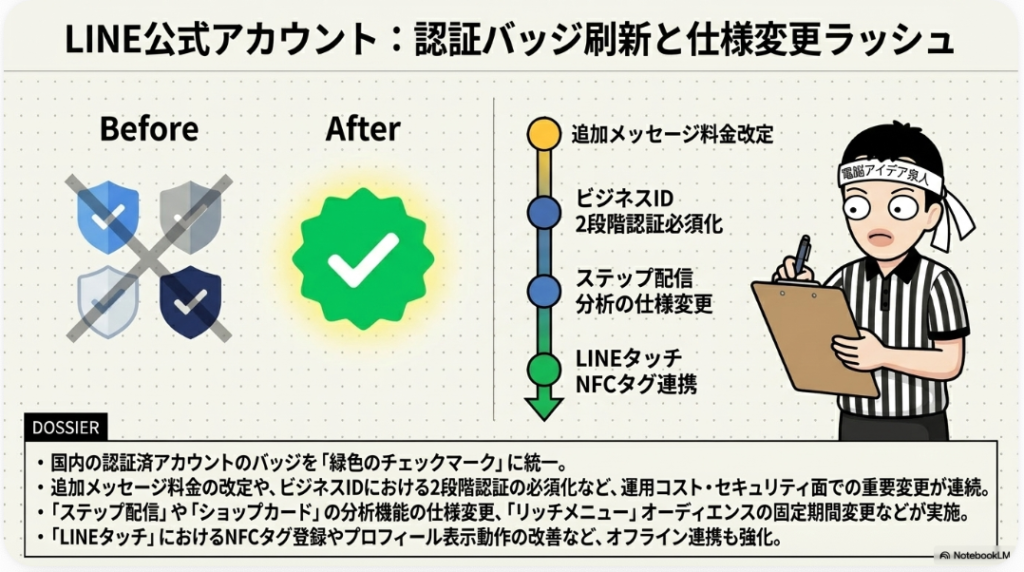 4. ✅ 認証バッジ LINE公式アカウントで刷新されたマークのこと。国内の認証済みアカウントは緑のチェックマークに統一されました。従来は大手ブランドが緑、認証済みが紺色でしたが、全て緑に一本化。未認証アカウントはバッジすら付かなくなり、認証済みと未認証の差が明確化しました。今後、認証取得の重要性がさらに高まると見られます。