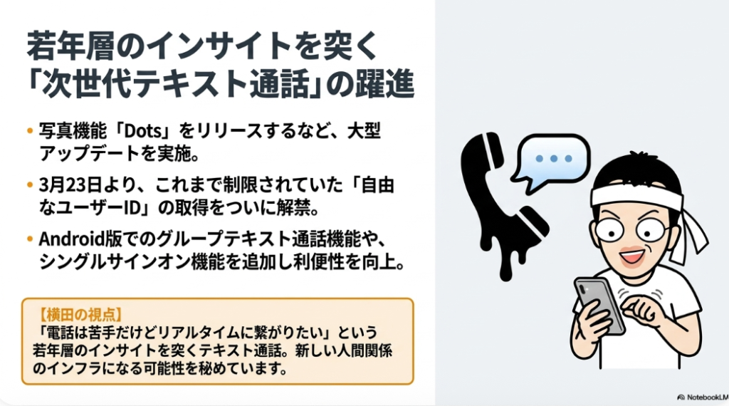 そしてJiffcyこれ結構変わってまして、大型アップデートで写真機能Dotsをリリース、これも後日解説したいなと思ってますが、そしてですね、自由なIDを取得できるようになります。これ、自分のID取りたいですね。さらにはですね、グループチャット、テキスト、通話機能がAndroidにも追加になりましたということとか、あとシングルサインオン機能がリリースされたりとかしてちょっと動きがありますので、ここでまた追って解説したいなと思ってます。