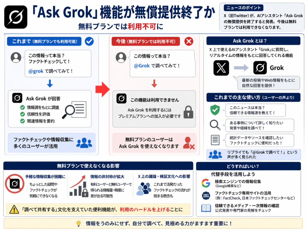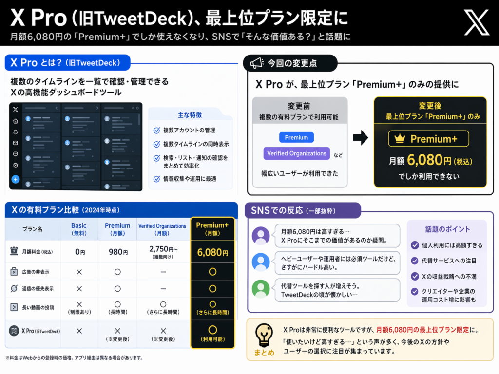 7. 💰 X Pro 旧TweetDeckにあたるXの高機能ツール。複数カラムでタイムラインを管理できる便利なサービスですが、最上位プランでしか利用できなくなり、月額6,080円が必要になりました。価格に見合う価値があるか議論を呼んでいます。同時にAsk Grokの無償提供も終了し、Xの有料化が加速している現状がうかがえます。