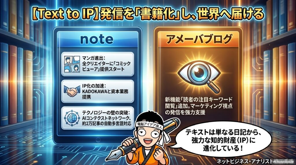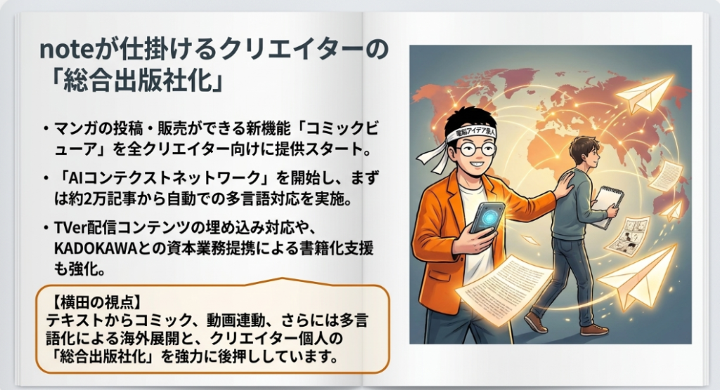 9. 📖 コミックビューア noteが全クリエイター向けに提供を開始した新機能で、漫画の投稿販売が可能になりました。AI生成漫画との相性も良く、個人クリエイターの新たな収益化手段として注目されています。さらにnoteはKADOKAWAと資本業務提携を結び、書き手発掘や書籍化を目指す動きや、約2万記事の多言語AI対応も進めています。