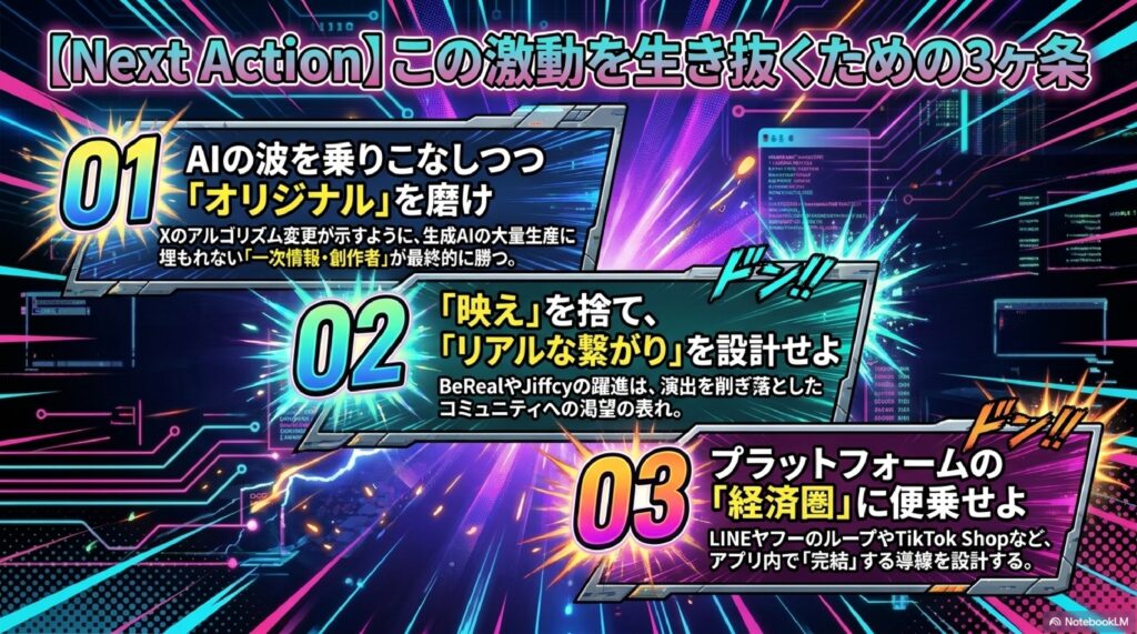 第二は「収益化導線の内製化」です。Xのスレッド途中有料化、noteのコミックビューア、TikTokのLIVEオークションなど、20大SNSは外部サービスに頼らずプラットフォーム内で収益化を完結させる動きを強めています。クリエイターにとっては、どのSNSの収益化設計が自分のコンテンツと相性が良いかを見極める視点が重要になります。第三は「AIによる参入障壁の崩壊」です。自動翻訳で言語の壁が消え、AI作画で漫画制作の難易度が下がり、AIとの対話でフィードを自作できる時代が到来しました。これまで技術や資本で区切られていた参入障壁が次々と崩れ、20大SNSのどれもが個人クリエイターにとって勝負できる土俵へと変わっています。2026年以降は、この3つの潮流を前提に20大SNSを戦略的に使いこなせるかが、マーケティング成果を大きく左右するでしょう。