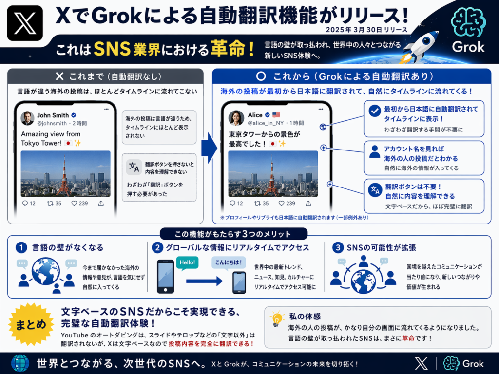 5. 🌍 Grok自動翻訳 Xが2026年3月30日にリリースした翻訳機能です。海外ユーザーの投稿が最初から日本語に翻訳された状態でタイムラインに流れてきます。従来はリポスト時に翻訳ボタンを押す必要がありましたが、その手間がなくなり、言語の壁が完全に取り払われました。SNS業界に革命をもたらす機能として大きなインパクトを与えています。