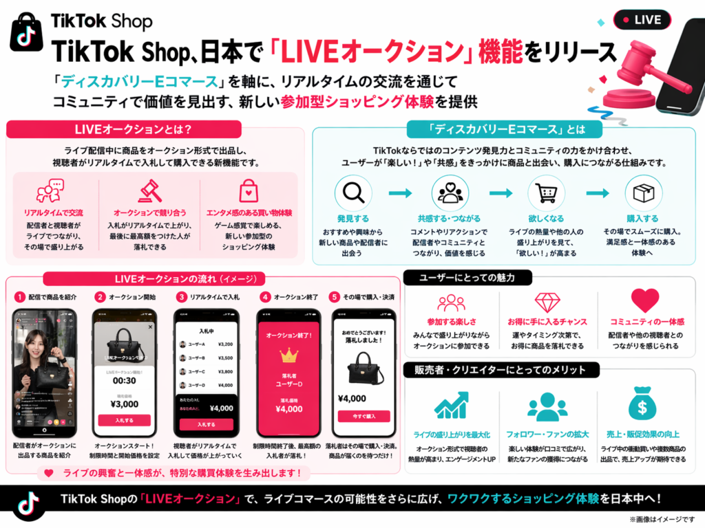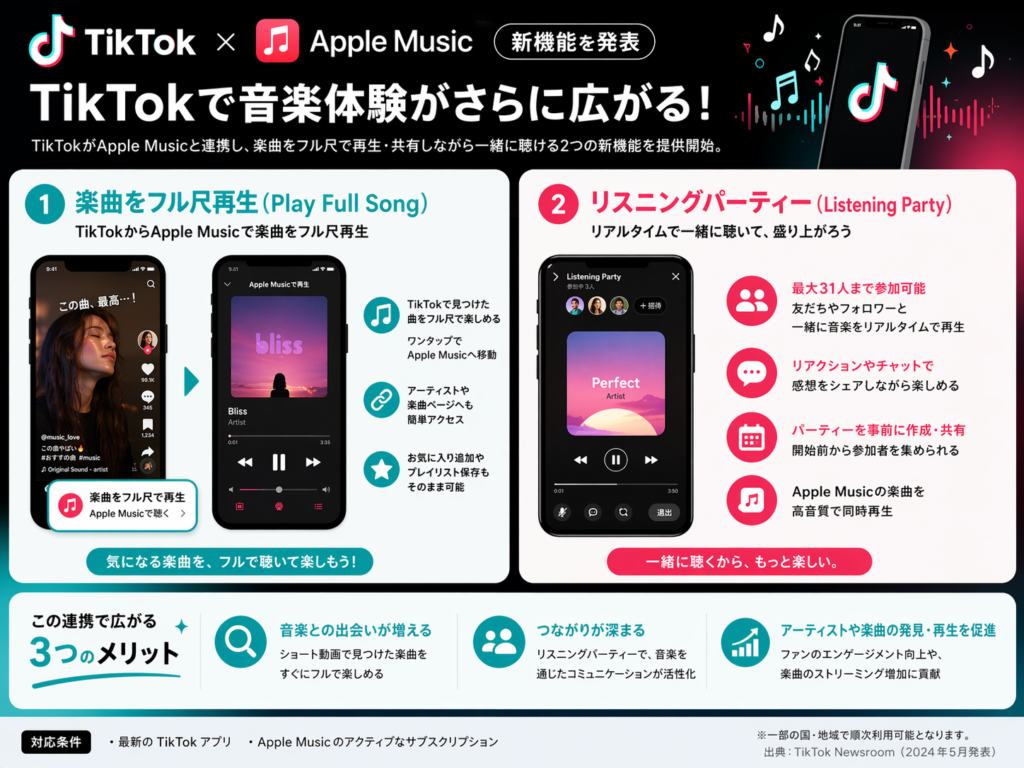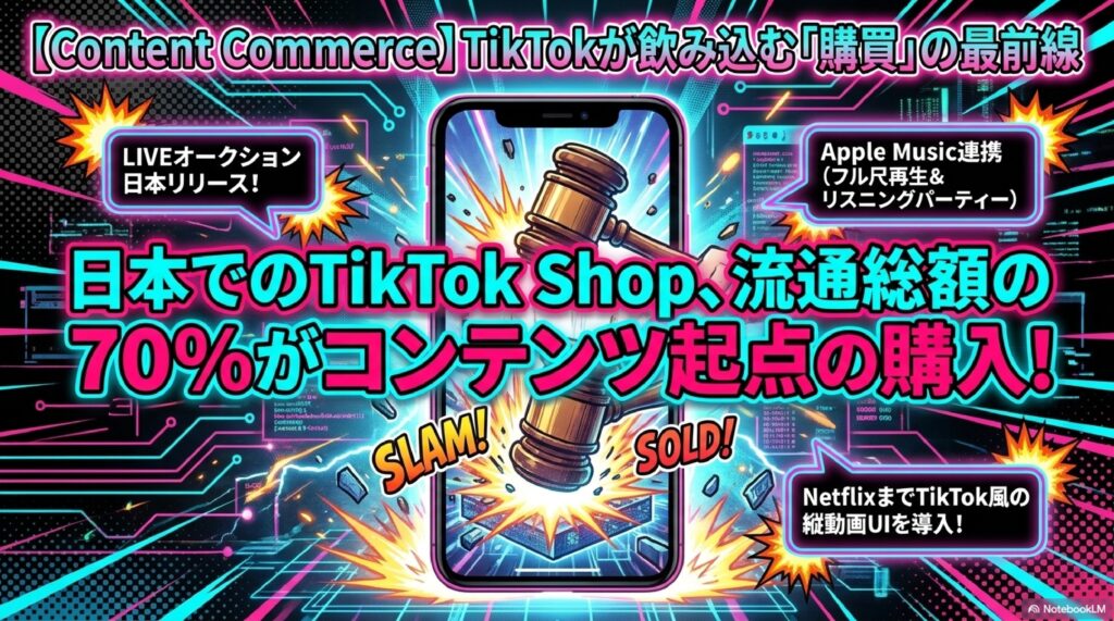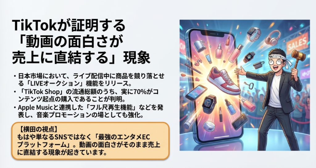 TikTok自身の機能拡張も加速しています。日本のTikTok ShopではLIVEオークション機能がリリースされ、ライブコマースに続く新しい双方向販売手法として注目を集めています。視聴者がリアルタイムで入札する体験は、エンタメとEコマースを融合させる新しい購買体験を生み出しつつあります。さらに音楽領域ではApple Musicとの連携により楽曲のフル尺再生に対応しました。これまで短尺BGMとして楽曲を切り取るだけだったTikTokが、音楽配信プラットフォームとしての側面を持ち始めた意味は非常に大きいと言えます。ショート動画で楽曲と出会い、そのままフル尺で楽しめる体験導線は、音楽業界のプロモーション設計そのものを変える可能性を秘めています。TikTokは20大SNSの中でも、他業界へ波及する変化の震源地であり続けています。