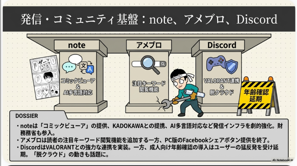 20大SNSのビジネス・ブログ系サービスも、2026年前半に地道ながら重要なアップデートを積み重ねています。アメブロではパソコン版でのFacebookシェアボタン提供が終了し、代わりに「読者の注目キーワード」が確認できる機能が追加されました。ブロガーにとっては、自身の発信が読者のどんな関心を引いているかをデータで把握できる貴重な指標となり、記事戦略の精度を高める武器になります。Meta系サービスとの連携が弱まる一方で、自プラットフォーム内の分析機能を強化する方向性は、アメブロが独立した価値を再定義しようとする姿勢の表れです。