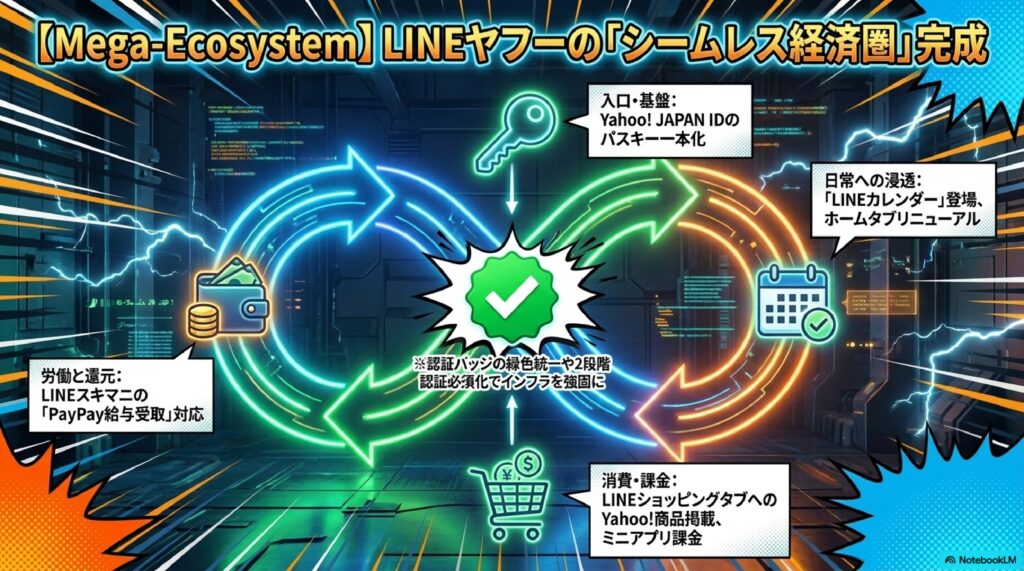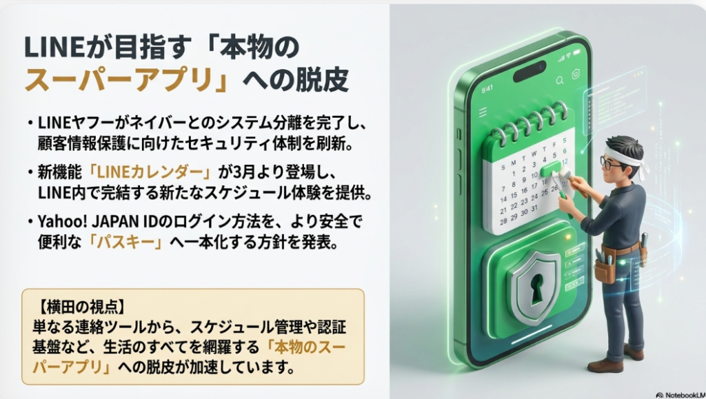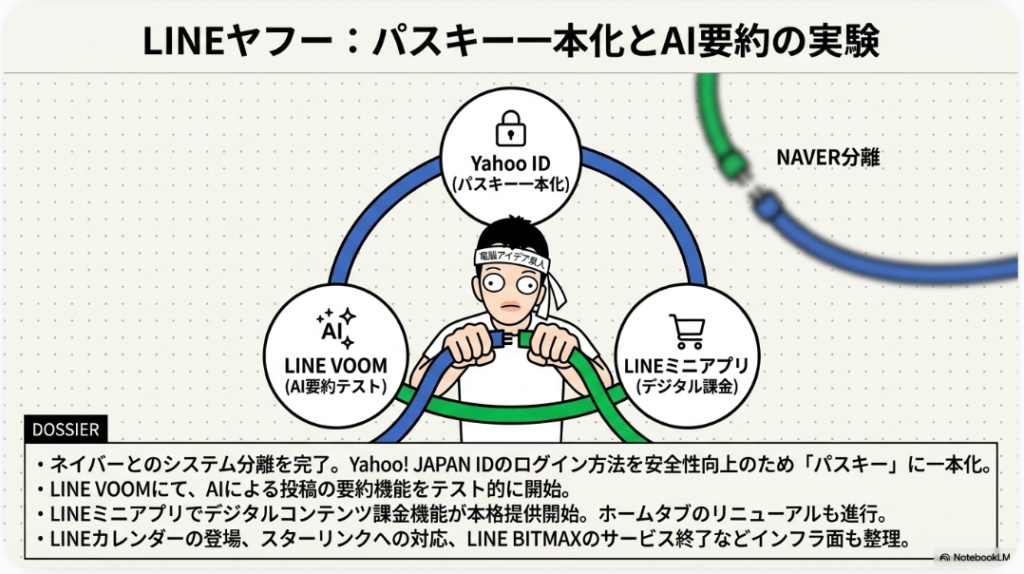 20大SNSの中でも国内インフラとして不動の地位を築くLINE・LINE公式アカウントは、2026年3月から4月にかけて複数の大型変革を迎えました。まず最も注目すべきはLINEヤフーとネイバーのシステム分離完了です。過去に問題視されてきた個人情報の海外保管や流出リスクに対し、数年かけて進められてきた分離作業がついに完結し、Yahoo! JAPAN IDはパスワードと2段階認証を廃止してパスキーへの一本化を発表しました。これは単なる認証方式の変更ではなく、日本のデジタル認証文化が大きく転換する象徴的な動きです。