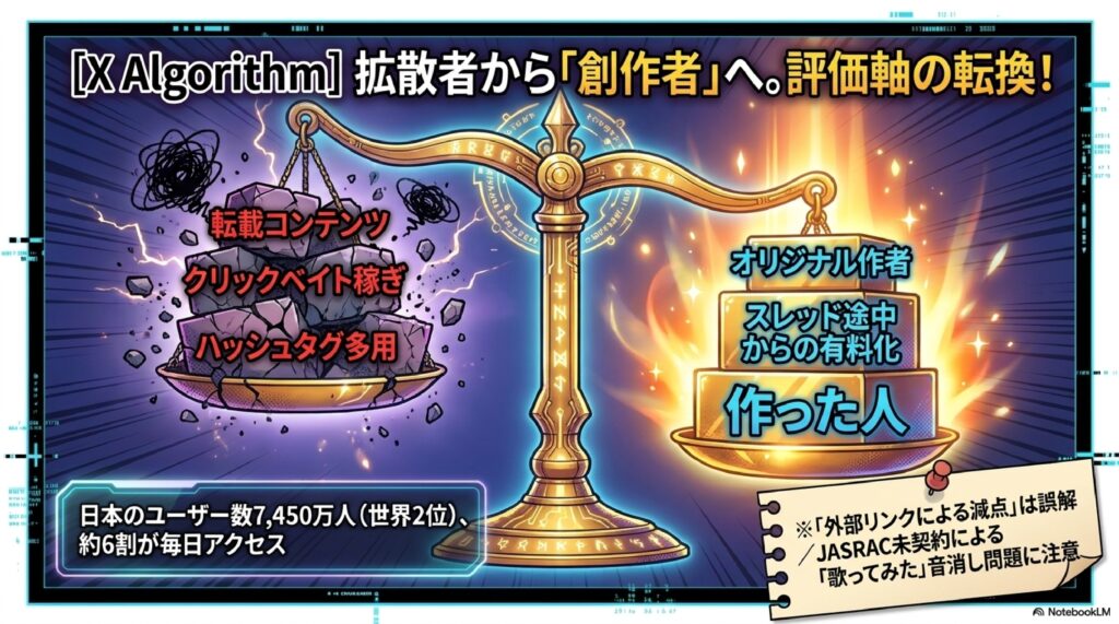 6. 🎵 JASRAC 日本音楽著作権協会のこと。XはJASRACと契約していないため、歌ってみたの投稿や歌詞の掲載をすると音が消される仕様になっています。YouTubeやTikTokはJASRACと契約済みで問題ありませんが、Xで音楽関連の投稿をする際には注意が必要です。著作権管理の違いがSNS利用に大きく影響を与える事例となっています。