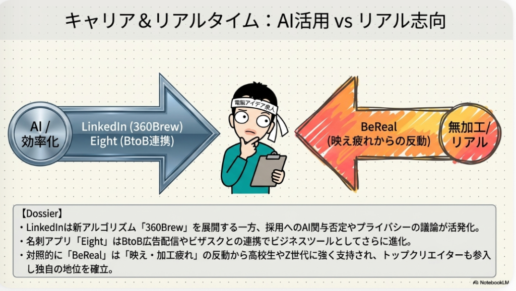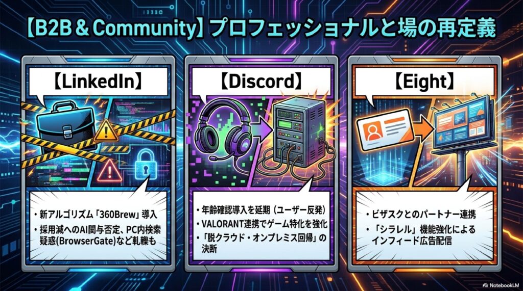 ビジネスSNSのLinkedInと名刺管理から発展したEightは、いずれも業界連携や提携を軸にした静かな進化を続けています。大きな話題性のある新機能こそ少ないものの、法人向けの実用的な機能拡張が継続的に行われており、20大SNSの中でもBtoBマーケティングや採用広報で存在感を増しています。特にリモートワークや副業の一般化を背景に、LinkedInの日本国内での注目度は年々高まっており、外資系企業や専門職採用では欠かせないプラットフォームとなりました。Eightも名刺データを起点とした関係構築ツールとして、営業やネットワーキングの現場で広く活用されています。20大SNSを語る際、個人向けサービスだけでなくこれらビジネス特化型プラットフォームの動向も欠かせない要素です。
