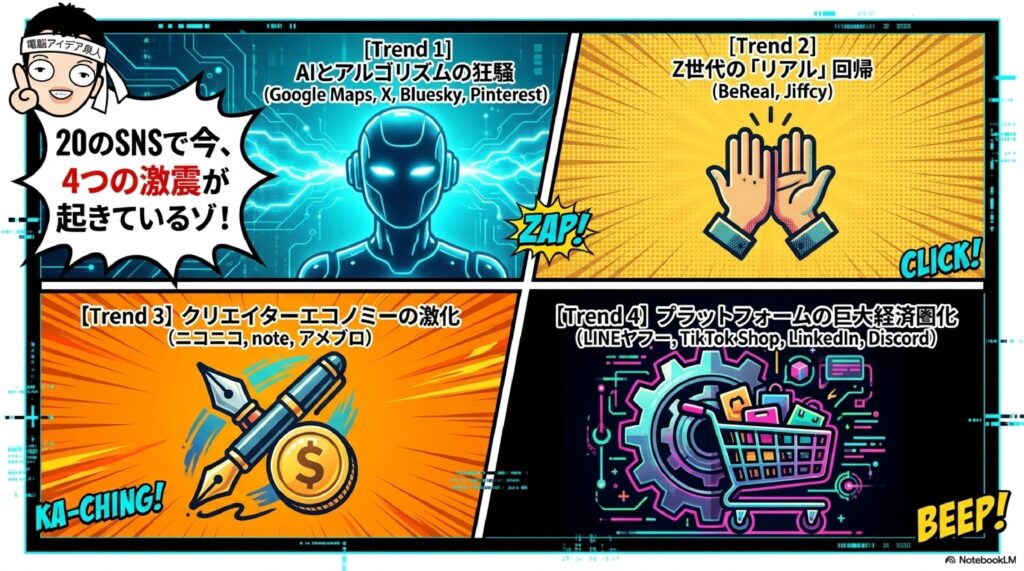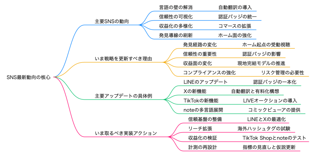 第二に「未成年保護と年齢確認の強化」です。Pinterestが16歳未満のソーシャルメディア利用禁止を提唱し、Discordでも年齢確認導入の動きが本格化しています。各国の規制強化を背景に、20大SNS全体で未成年者の利用制限が広がる兆しがあります。第三に「動画フォーマットの収束」です。NetflixがTikTok風の縦動画を導入し、ニコニコ動画もショート動画機能を追加するなど、あらゆるメディアが縦型ショート動画に最適化されつつあります。加えてTikTokはApple Musicと連携してフル尺再生に対応するなど、ショートとロングの融合も進行中です。この3つの潮流を理解することで、20大SNSの全体動向を戦略的に読み解けるようになります。