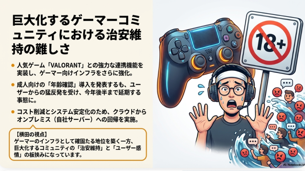 はい、続いてDiscordに関するニュースなんですが、どうでしょうかね。あ、これ大きいですね。「ユーザーの反発を受け、年齢確認の導入を延期」ってことで、自分の写真を撮られたりとか、あとはクレジットカードの認証とかですね、こういったものして、成人と成人じゃないものをですね、ちゃんと年齢認証できるようにしますよっていうこと、ゲームユーザーが多いと、あと若い人が多いので、この辺で結構反発食らってですね、どうも導入が延期されていますということで、さっきのSNSを何歳からやらせるか問題もあるんですが、この辺少し注目なのかなと思っています。