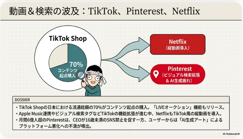 8. 🎬 縦動画(ショート動画) TikTokの影響があらゆるメディアに波及し、ついにNetflixまでTikTok風の縦動画機能を導入しました。ショート動画はSNSだけでなく動画配信サービスにも広がり、視聴スタイルが大きく変化しています。ニコニコ動画もショート機能を追加、TikTokはApple Music連携で楽曲のフル尺再生に対応するなど、縦動画トレンドは今後も拡大します。