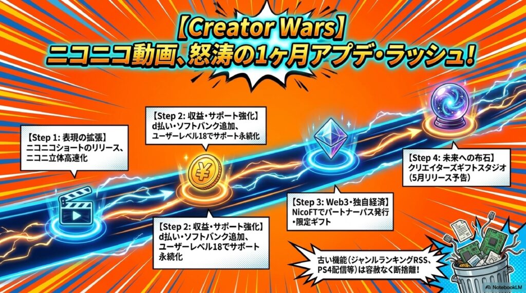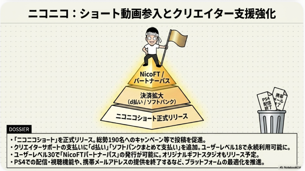 20大SNSの中で独自のコミュニティ文化を育ててきたニコニコ動画も、2026年に入り重要な転換点を迎えました。最大の動きはショート動画機能の追加です。TikTokやYouTubeショートが動画視聴の主流となる中、長尺コメント付き動画を象徴としてきたニコニコ動画がショートフォーマットに参入したことで、新しいユーザー層の獲得と既存ユーザーの滞在時間向上の両立を狙う戦略がスタートしました。これは単なる機能追加ではなく、ニコニコ動画という20大SNSの一角が再び成長軌道に乗るかを占う重要な試みです。
