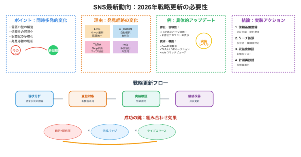 20大SNSの最新動向を俯瞰すると、2026年以降の業界を左右する3つの大きな潮流が浮かび上がります。第一は「認証と信頼性の可視化」です。LINE公式アカウントの認証バッジ刷新やYahoo! JAPAN IDのパスキー移行に見られるように、20大SNSは全体として「誰が発信しているか」をユーザーに明示する方向へ進化しています。認証の有無が情報の信頼性や広告効果を左右する時代になり、企業・個人問わず認証取得が競争力の基盤となります。