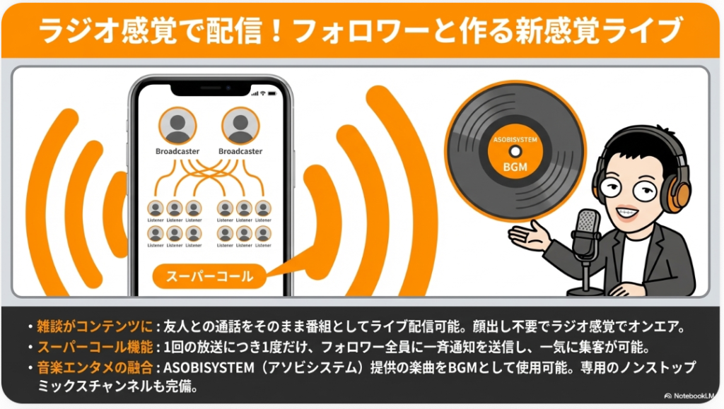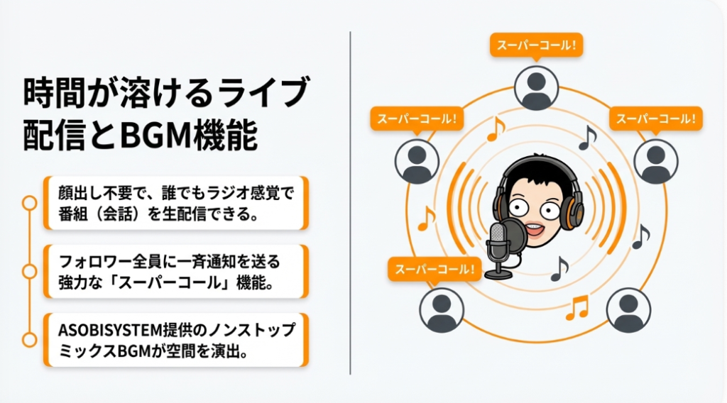 A4. はい、ライブ配信機能はアカウントを作成した誰でも利用できます。通話画面の下部にある「ライブの準備」ボタンからジャンルを設定し、「ライブをスタート」を押すだけで配信が始まります。さらに「スーパーコール」機能を使えば、フォロワーにライブ開始の通知を一斉に送ることもできます。リスナーとして聞くだけの参加も可能なので、まずは誰かの配信を視聴してみるのもおすすめです。