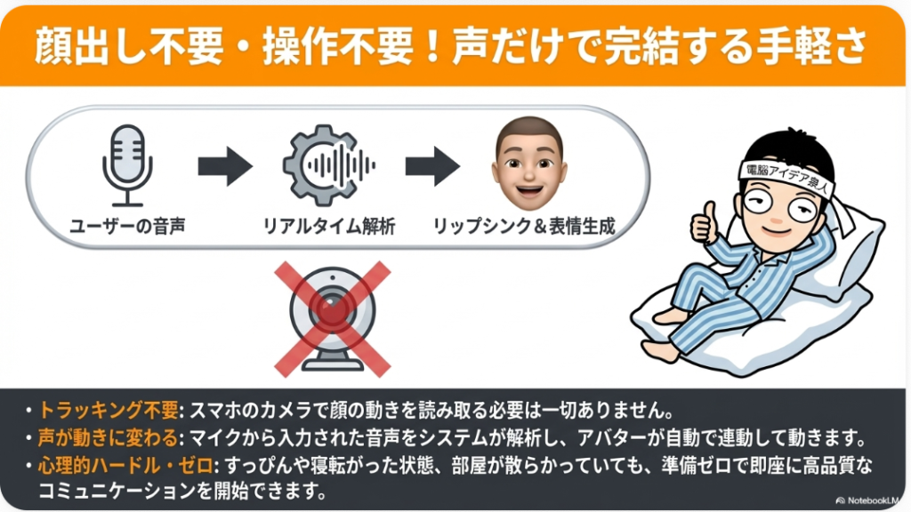 ここで注目すべきなのが、完全にバーチャルで作られているという点です。カメラで自分の動きを読み取っているわけではなく、声に反応してリップシンク(唇が動く)という形になっています。喋るのをやめると唇の動きも止まります。カメラを使わないのにアバターが自然に動くというのは、技術的にも面白いポイントです。