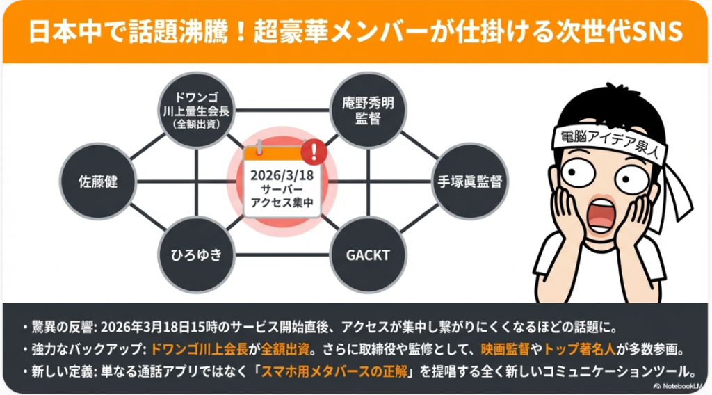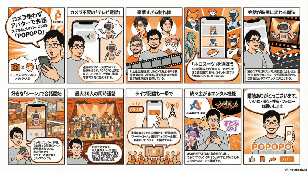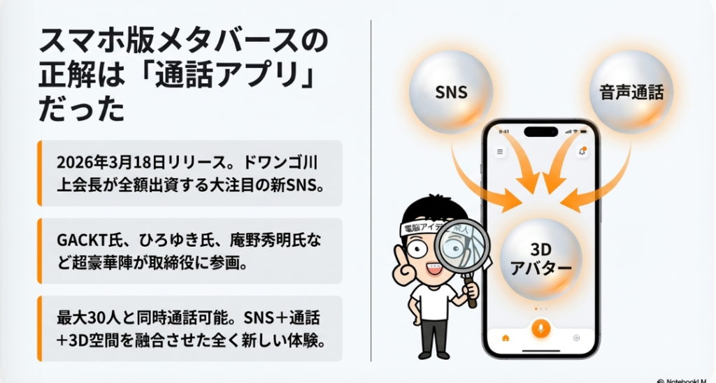 🌐 POPOPO 2026年3月18日にリリースされた、スマホ専用のメタバースSNSアプリ。ドワンゴの川上会長が全額出資し、取締役にGACKT・ひろゆき・庵野秀明など著名人が参加している。カメラ不要で3Dアバターを使った通話やライブ配信ができる新しいコミュニケーションサービスとして注目を集めている。