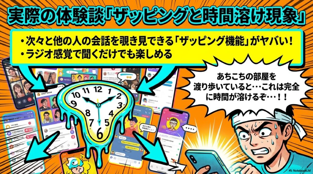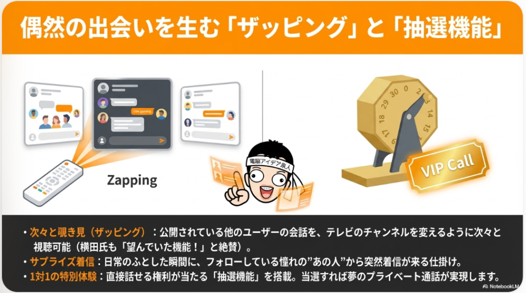 🔀 ザッピング機能 他ユーザーの会話を次々と切り替えながら視聴できる機能。テレビのチャンネルを変えるように、さまざまな会話ルームを気軽に覗けるのが特徴。配信者にとっては新たなリスナーとの出会いの機会を生み、ユーザーにとっては興味のある会話を偶発的に発見できる仕組みとして期待されている。