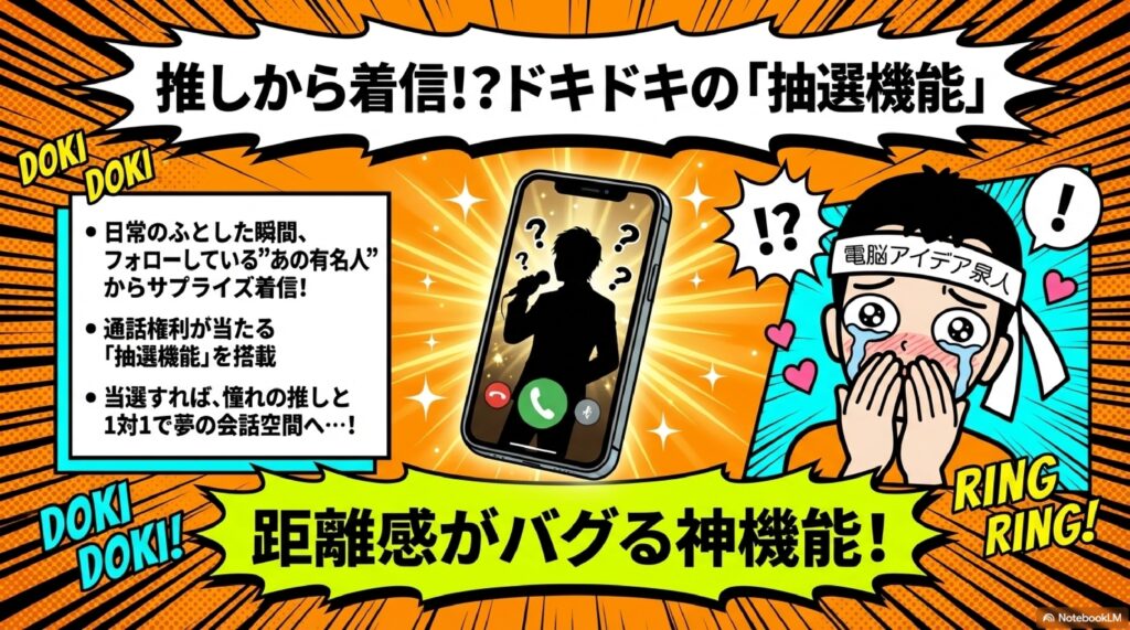 POPOPOではサービス開始を記念して、大型キャンペーンやユニークな機能が用意されています。中でも注目は「1億円ひとりじめ!! POPOPOで通話するだけキャンペーン」です。2026年3月19日から4月19日までの期間中にPOPOPOで1分以上の通話を行うだけで自動的に応募が完了し、抽選で1名に現金1億円(源泉税控除後に振込)が当たるという驚きの内容です。CMキャラクターには令和ロマンの髙比良くるまさんが就任しており、キャンペーンの認知度も高まっています。応募条件が「1分以上の通話」とシンプルなため、アプリをインストールしたらまず通話を1回行っておくのが賢明です。また、POPOPOには「抽選機能」と呼ばれるユニークな仕組みがあります。これはフォローしている著名人やインフルエンサーから、ランダムで通話の着信が届くという機能で、当選すれば憧れの人と1対1で会話ができる可能性があります。この機能を最大限活用するには、気になる著名人や配信者のアカウントを積極的にフォローしておくことがポイントです。フォロワー数が少ない初期段階のほうが当選確率が高い可能性もあるため、早めにフォローしておくことをおすすめします。