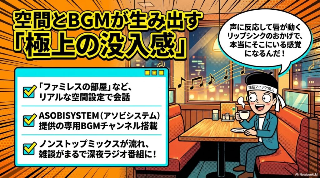 🎬 映画的シーン POPOPO内の通話空間は映画のワンシーンのようなビジュアルで構成されている。ファミレスの部屋など具体的なロケーションが用意されており、ユーザーはその場にいるかのような臨場感を味わえる。日常の会話を映画のような体験に変えるというコンセプトが、他のSNSとの大きな差別化ポイントとなっている。