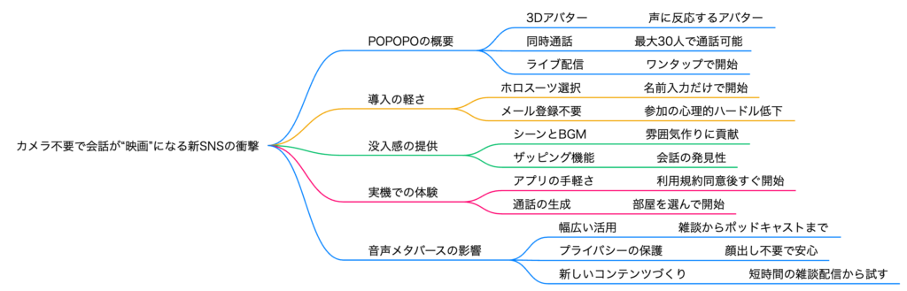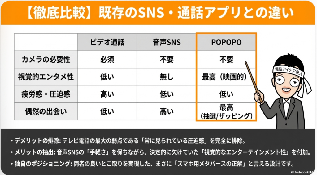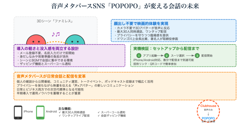 🏠 Clubhouseとの類似性 POPOPOは音声ベースのSNSという点で、2020年頃に流行したClubhouseと共通点がある。ただしPOPOPOは3Dアバターと映画的空間を組み合わせた「メタバース版Clubhouse」といえる進化形。視覚的な体験が加わることで没入感が高まり、音声だけでは得られない新しいコミュニケーション体験を提供している。