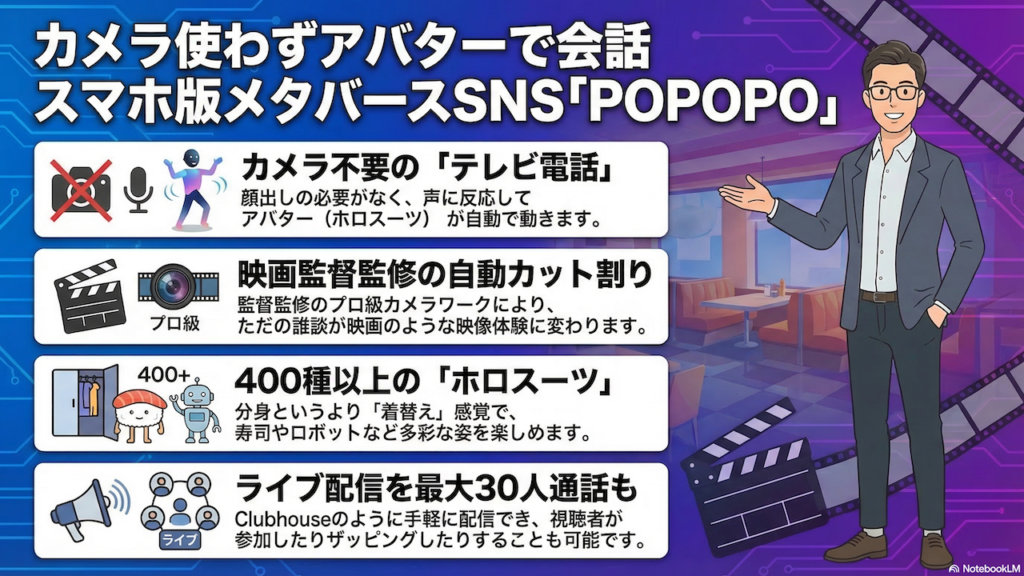 POPOPOには、既存のSNSや通話アプリとは一線を画す5つの特徴があります。1つ目は「カメラのいらないテレビ電話」という点で、スマートフォンのカメラを起動する必要がなく、声だけで3Dアバター同士の会話シーンが自動生成される仕組みになっています。従来のメタバースサービスではカメラに連動してアバターが動くのが一般的でしたが、POPOPOではその手間を完全に排除しました。2つ目は「映画のようなカメラワーク」です。会話の流れに合わせてカメラアングルが自動で切り替わり、すべてのカット割りは手塚眞監督が監修しています。そのカット数は劇場映画1本分に相当するとのことで、まるで映画のワンシーンにいるかのような体験が可能です。3つ目は「顔出し不要のライブ配信機能」で、ラジオ感覚で気軽に配信を始めることができます。4つ目は「抽選機能」で、フォローしている著名人やインフルエンサーから突然通話の着信が届く可能性があるという、他のSNSにはないユニークな仕組みです。5つ目は400種類以上の「ホロスーツ」で、ファッション感覚でアバターの外見を自由に着せ替えられます。これらの特徴を総合すると、POPOPOはClubhouseのような音声コミュニケーションの手軽さと、メタバースの没入感を兼ね備えた新しいジャンルのSNSと言えるでしょう。