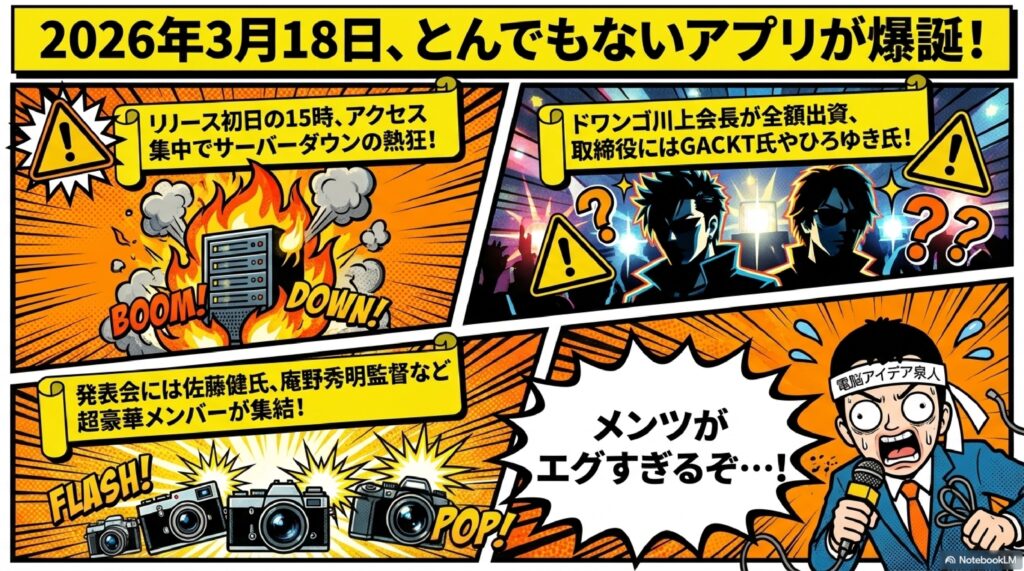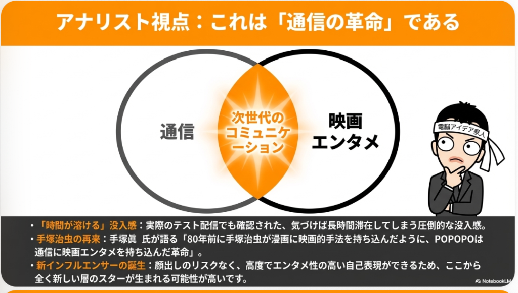 🏢 ドワンゴ・川上会長 ニコニコ動画などを手がけるドワンゴの川上量生会長がPOPOPOに全額出資している。ネット文化に精通した経営者が私財を投じていることから、エンタメとテクノロジーの融合を強く意識したサービス設計が期待される。著名クリエイターを取締役に迎える人選にもその戦略がうかがえる。