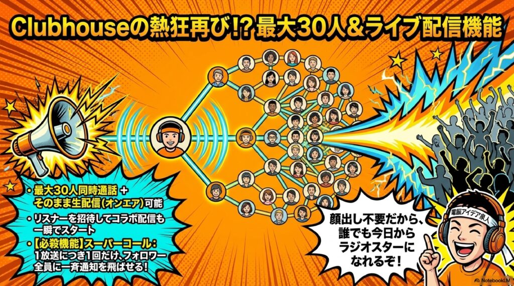 実際にやってみると、これは結構手軽です。配信を始めるまでのステップが非常にシンプルで、Clubhouseを使ったことがある方ならすぐに馴染めるでしょう。