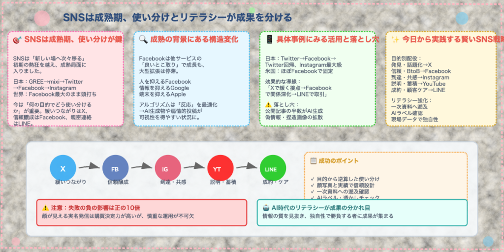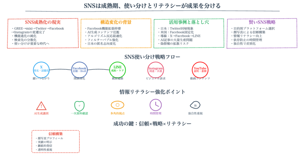 ソーシャルメディアの台頭から現在に至るまでの変遷を振り返ってきました。日本と世界でのSNSの巣移りの違い、TwitterとFacebookに代表される異なるコミュニケーションスタイル、実名制と匿名制の使い分け、そして最新の生成AI問題まで、ソーシャルメディアは常に進化し、新たな課題に直面してきました。特に印象的なのは、生成AIの台頭によってSNSの在り方そのものが問われている現状です。オンライン記事の約半数がAI生成という現実は、私たちに「SNSに何を求めるのか」という根本的な問いを投げかけています。リアルな人間のつながりを求めるのか、情報の効率的な取得を求めるのか、あるいは自己表現の場を求めるのか。それぞれの目的に応じて、適切なプラットフォームを選び、使い分けることが重要です。今後、リアルとAIでSNSが分かれていく可能性もありますが、どのような形に進化していくにせよ、私たちユーザー自身がメディアリテラシーを高め、批判的思考を持ちながらSNSと向き合っていくことが求められています。ソーシャルメディアは、これからも私たちの生活に深く関わり続けるでしょう。その変化を理解し、賢く活用していくことが、デジタル時代を生きる私たちに必要なスキルなのです。