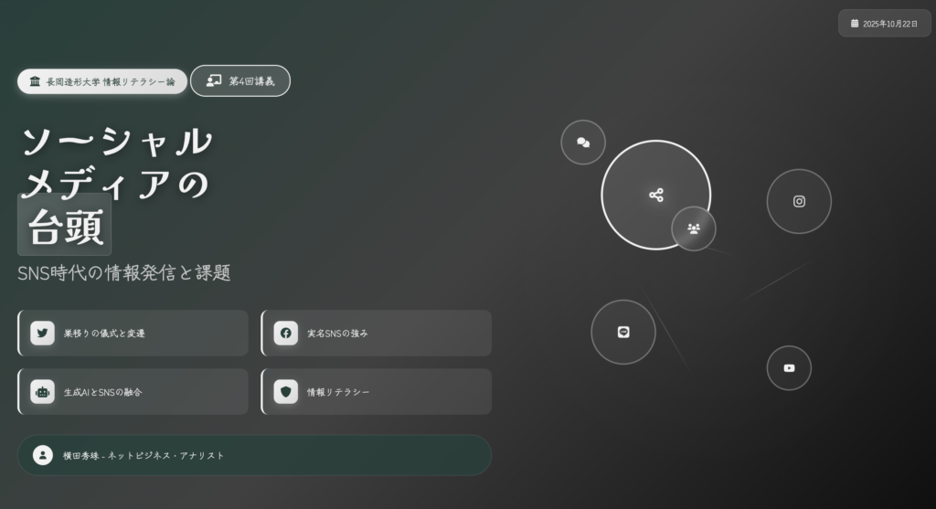 皆さんは普段、どのようなソーシャルメディアを使っていますか?Instagram、X(旧Twitter)、Facebook、それともLINE?今や私たちの生活に欠かせない存在となったソーシャルメディアですが、その歴史を振り返ると、実に興味深い変遷を遂げてきました。2025年10月現在、ソーシャルメディアは新たな局面を迎えています。生成AIの台頭によって、私たちが目にするコンテンツの約半数がAIによって作られているという驚くべき現実があります。本記事では、長岡造形大学の情報リテラシー論第4回目の講義内容をもとに、ソーシャルメディアの台頭から現在に至るまでの変化、そして未来への展望について詳しく解説していきます。実名SNSと匿名SNSの違い、日本特有のSNS文化、そしてAI時代のSNSのあり方まで、幅広くお伝えしていきますので、ぜひ最後までお付き合いください。